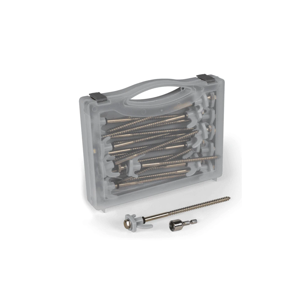 Supplied in a carry box, the Kampa Steel Screw Tent Pegs have a 13mm Hex Head and are designed for hard ground. They can be screwed into the ground by hand or using a drill with the adaptor included.